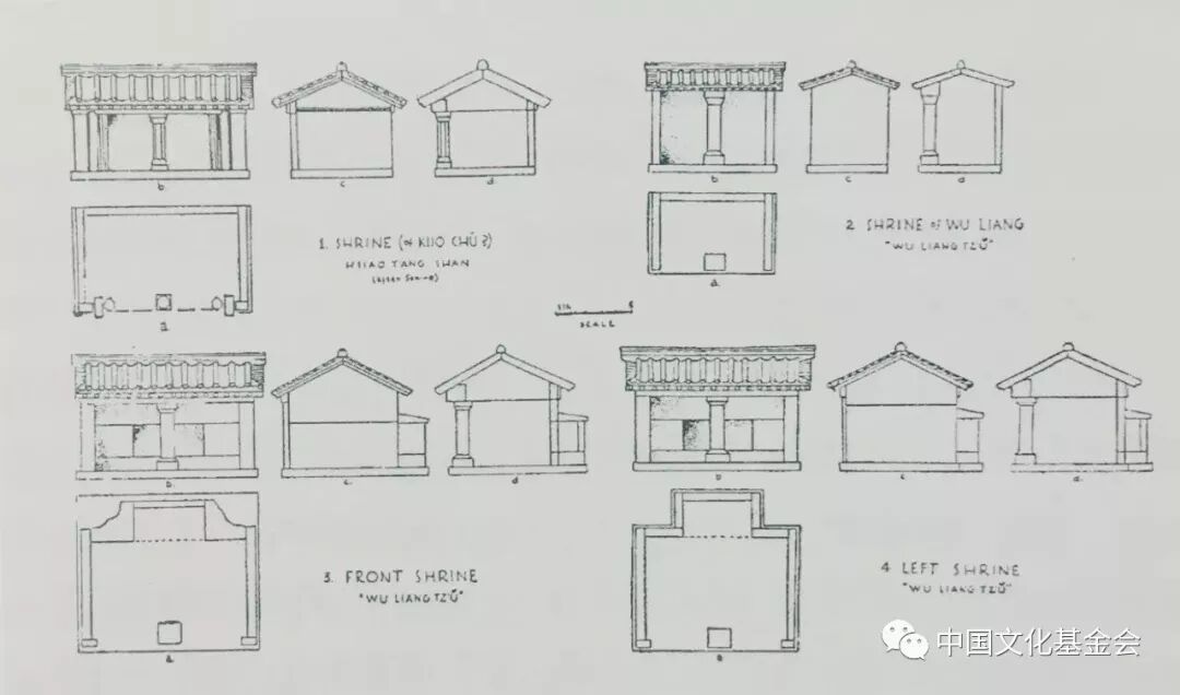 “建筑”二字之所以能跳到费慰梅的眼前,乃得益于梁思成、林徽因夫妇的影响。武氏祠原石均砌在墙内,费慰梅无法进行准确测量。她将拓片按照同一比例反拍,然后进行拼对,对照尚完整保存在地上的山东长清孝堂山东汉石祠,将这些散乱的石头复原成三座祠堂(图3)。