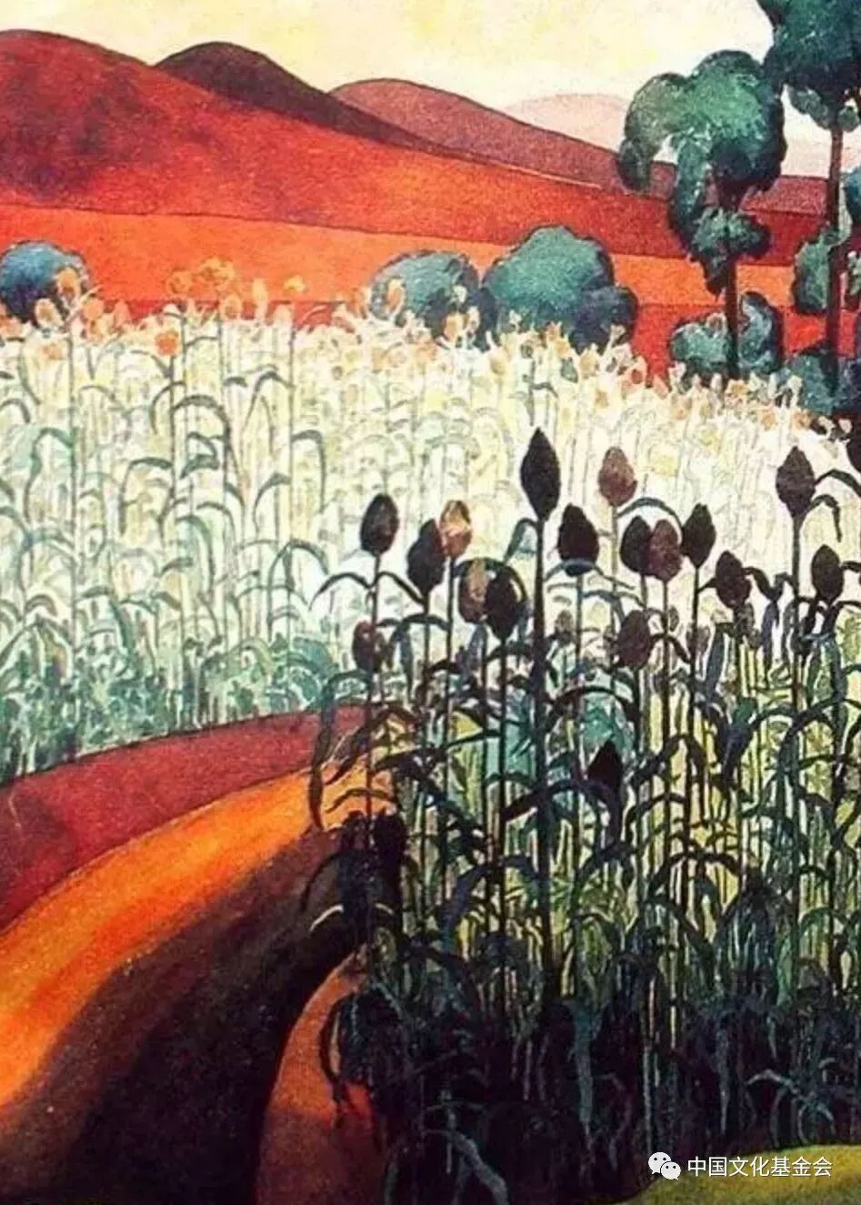 这些文字中迷人的色彩还见于费慰梅笔下一幅幅水彩画。她一路走,一路画,甚至将在北京的居室绘上壁画。她还曾在北京举办了一个小型的画展。在哈佛费正清研究中心的会议室里,今天仍陈列着她的几幅水彩画,有云岗石窟的外景、耕作的农民、色彩丰富的高粱地(图2)、拉骆驼的工人。