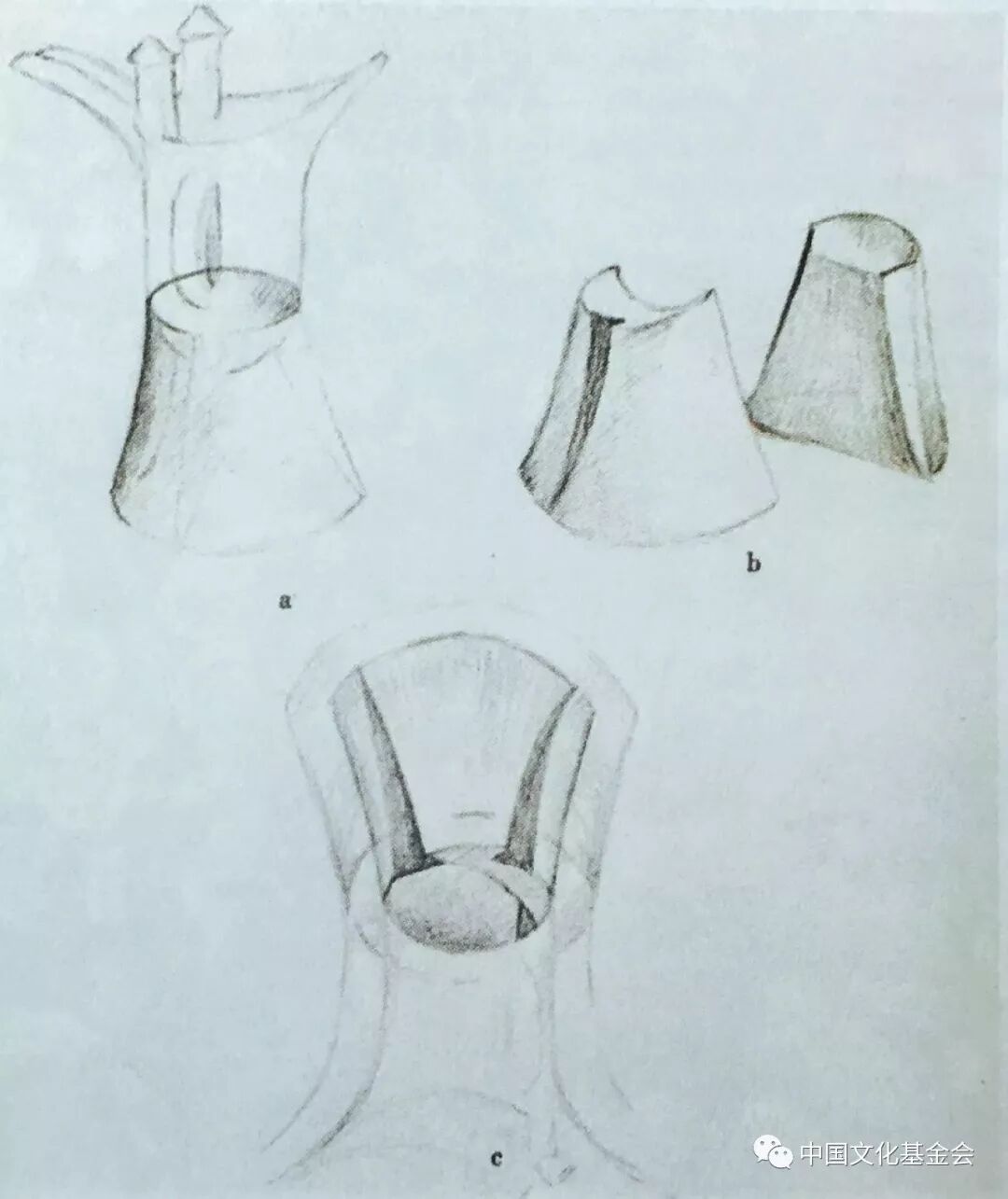 从中我们可以看到,费慰梅从汉代石刻研究中总结出的方法和理论得到了更广泛的运用。1964年,费慰梅利用在台北中研院访问的机会,与专门从事殷墟青铜器铸造技术研究的万家保合作,以安阳后岗出土的R1069号铜爵为标本,撰写了《商铜爵足的铸造:模具上的雕刻》(Shang Bronze Chueh Legs: Carved in the Mould)一文,次年发表(图5)。