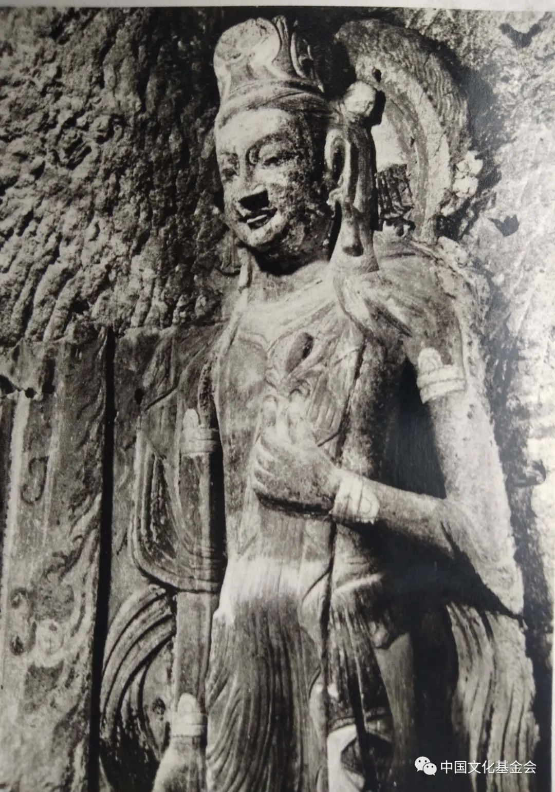麦积山巨像比拉梢寺成熟得多。此像佛垂坐中央,菩萨两旁侍立,构成方形画面,加之方形骨架,内方外圆,方形圆角,方圆相济,以直线为主,弧线为辅。方正圆融,法力无边。全都在讲方圆,无规矩不成方圆,看来这位无名大师是个解决方圆难题的高手,堪称巨匠。佛坐四头高,菩萨侍立五头高,皆矮胖敦厚。整个看上去,宏伟壮观,简洁明确,装饰性很强,艺术水平很高。我记不得哪位哲人曾说过:“真理是简洁明确的。”其实美(艺术)也是简洁明确的,真善美都是简洁明确的。此浮雕菩萨与上述第5窟菩萨相貌、姿态、风格都相近,也属张家样。