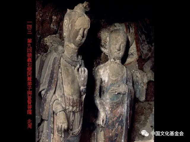 再如第142窟一佛二菩萨(三尊,正尊)很像龙门宾阳中洞正尊,也是“秀骨清像,褒衣博带”,说明麦积山学习龙门首都(洛阳)范式(6世纪前半),同属南京陆家样。麦积山北魏后期造像除佛、菩萨外,还有弟子迦叶、阿南,例如第87、85等窟中的迦叶,老成持重;第133、101、142、133、122、172等窟中的阿南,天真无邪,皆生动传神,富于个性,不但中国化了,而且还世俗化了。北魏时云冈、龙门、麦积山都有弟子像,而敦煌弟子像要到北周时才出现,再次说明中国佛像自东向西传播。