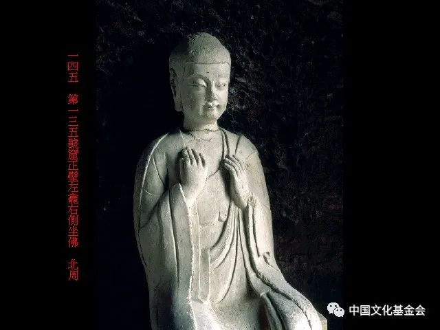再如第127窟正龛本尊坐佛,就与上述四川茂县出土的齐永明元年(483年)造的佛坐像非常相似,也是“秀骨清像,褒衣博带”,也是长方脸,五官平行,呈水平横线,也是以垂直线为主,弧线为辅,方形圆角,方圆相济,也是衣纹竖向平行,有节奏感,也属陆探微样式。
