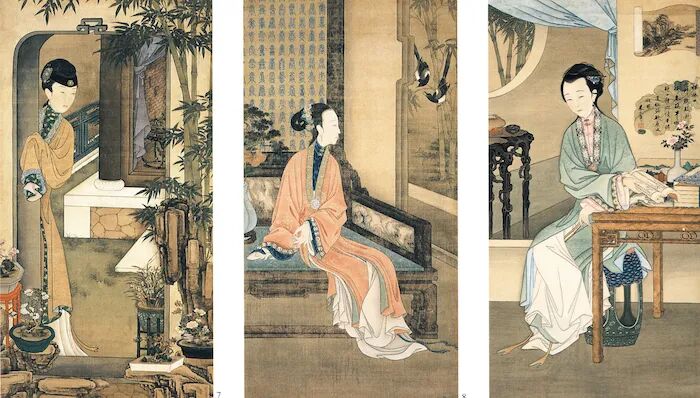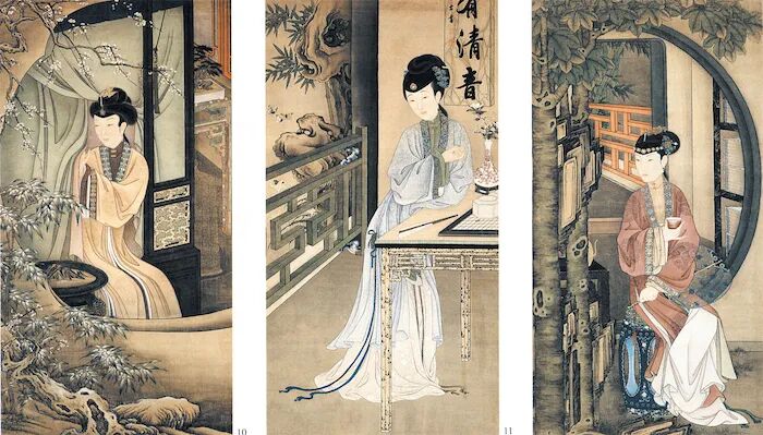 据此档案材料,这组美人画最初并非是装点墙壁的挂轴或贴落,而是一架十二扇围屏上的画面。专家也判定这架画屏是在1709年之后制成的,因为这一年康熙皇帝才将圆明园赐予雍亲王胤禛,胤禛因此才可能称自己为“圆明主人”。所以画屏的制作时间应该在1709年至1723年之间。受到这些启发,我在1996年出版的《重屏》一书和翌年发表的一篇文章中对这架画屏进行了讨论,结合围屏的最初陈设地点—圆明园深柳读书堂—对这些画像进行了讨论。在宏观的层面上,这个例子再次肯定了画屏与建筑环境的关系,证明对“屏上之画”的研究不能脱离屏风的陈设地点以及与拥有者的关系。