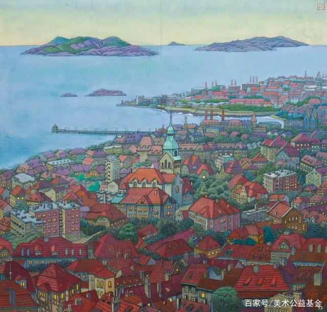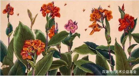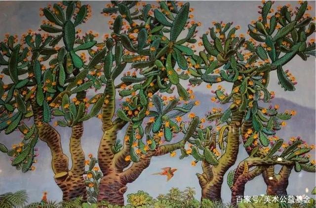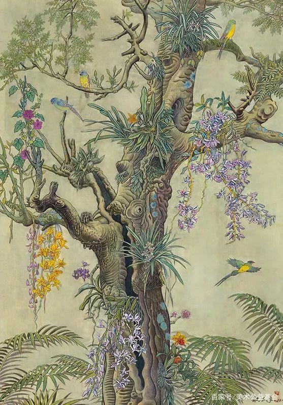 工笔重彩,特别严谨,构图繁复,工整细密。他的用色很讲究,所用的所有颜料全部由自己研磨调制而成,色泽饱和丰富,层次鲜明,刻画出斑斓的自然之色。这也得益于他用矿物质烧瓷的习惯,他把技术用在了绘画上。