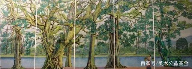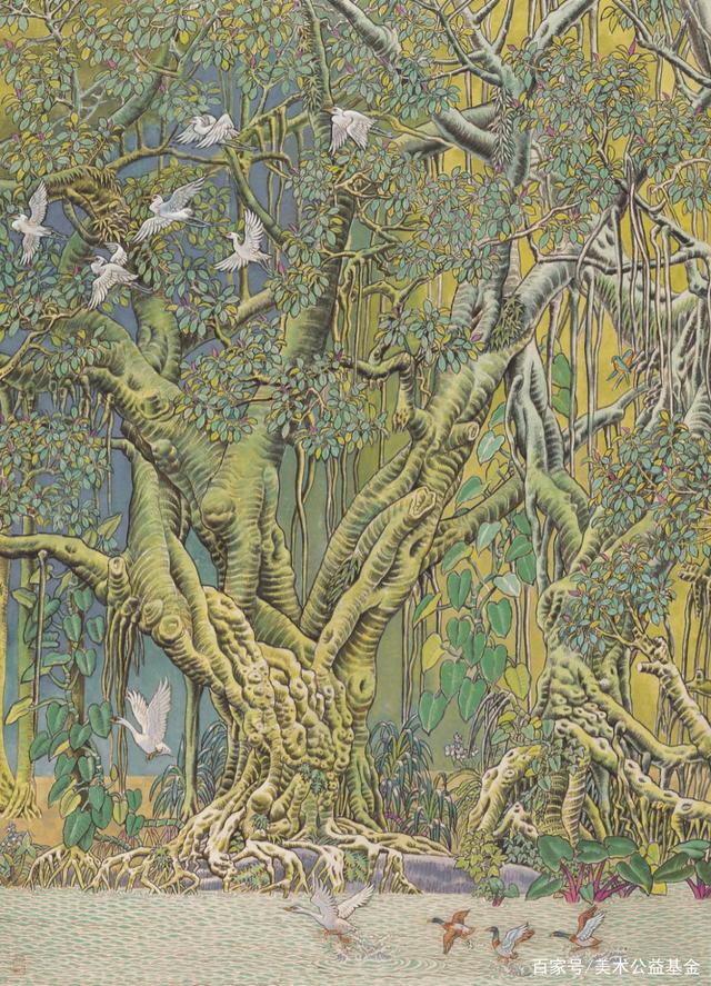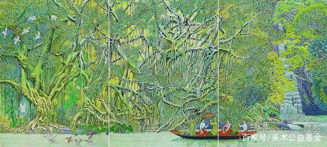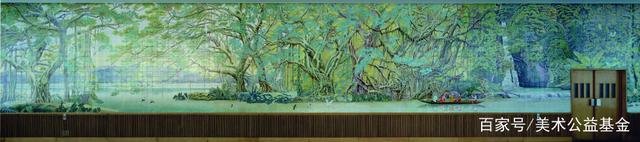 当今都市生活拥挤、繁忙,污染严重。人们渴望着回归自然,返璞归真。当代建筑努力探求人与自然和谐统一。壁画作为建筑装饰绘画,要表现生态环境,不论是原始森林,还是江南园林,都不是寥寥数笔所能表现出来的。大自然原本就是精雕细琢、耐人寻味的,而且生命也是最直接最真实的存在。所以我认为理想的画是大幅面的装饰画。若把人的灵感和遐想切割成互不相关的小碎片,就表现不出这种动人的气氛来。现代建筑的幕墻结构为我们提供了广阔的墻壁,它应该是个梦的墻面,气势磅薄的墻面,而不是各种小画排列的墻面。多年来我一直在探索,将传统工笔重彩手法与现代建筑的装饰要求相结合,既要保持其直觉有序的形象,又要把握具象与抽象,主观与客观之间的适当分寸,做到远看整体有气势,近看细节具体可信。文化传统造就了这种感染力与观赏者的相互心理感知。