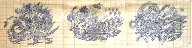 当时祝大年一家六口,住60平米的房子,雕塑太占空间,他只能搞搞小件,后来小件也没地方了。有了创作灵感只能画图(雕塑画稿),一件作品画好几张设计图稿,反复比较推敲,每张设计稿都用钢笔肯定下来,清楚明确,希望以后有条件,可以照图施工,完成雕塑。这样的雕塑稿他画了很多,现存有近百幅。可惜的是他至死也没有条件制作完成这些雕塑作品。