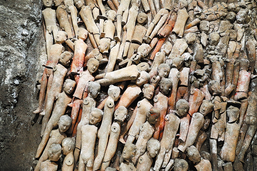 考古发掘了江村大墓的8座外藏坑,出土陶俑、铜印、铜车马器及铁器、陶器等1500余件,铜印印文有“车府”“器府”“中骑千人”“府印”“仓印”“中司空印”等,表明江村大墓周围外藏坑应为模仿现实官署、府库建造。江村大墓的形制、规模均符合西汉最高等级墓葬规格,加之其周边分布窦皇后陵、薄太后陵,专家确认江村大墓为汉文帝霸陵。