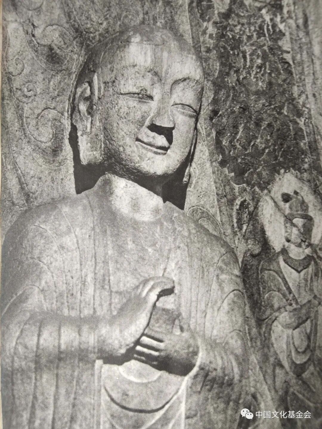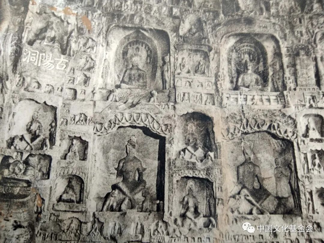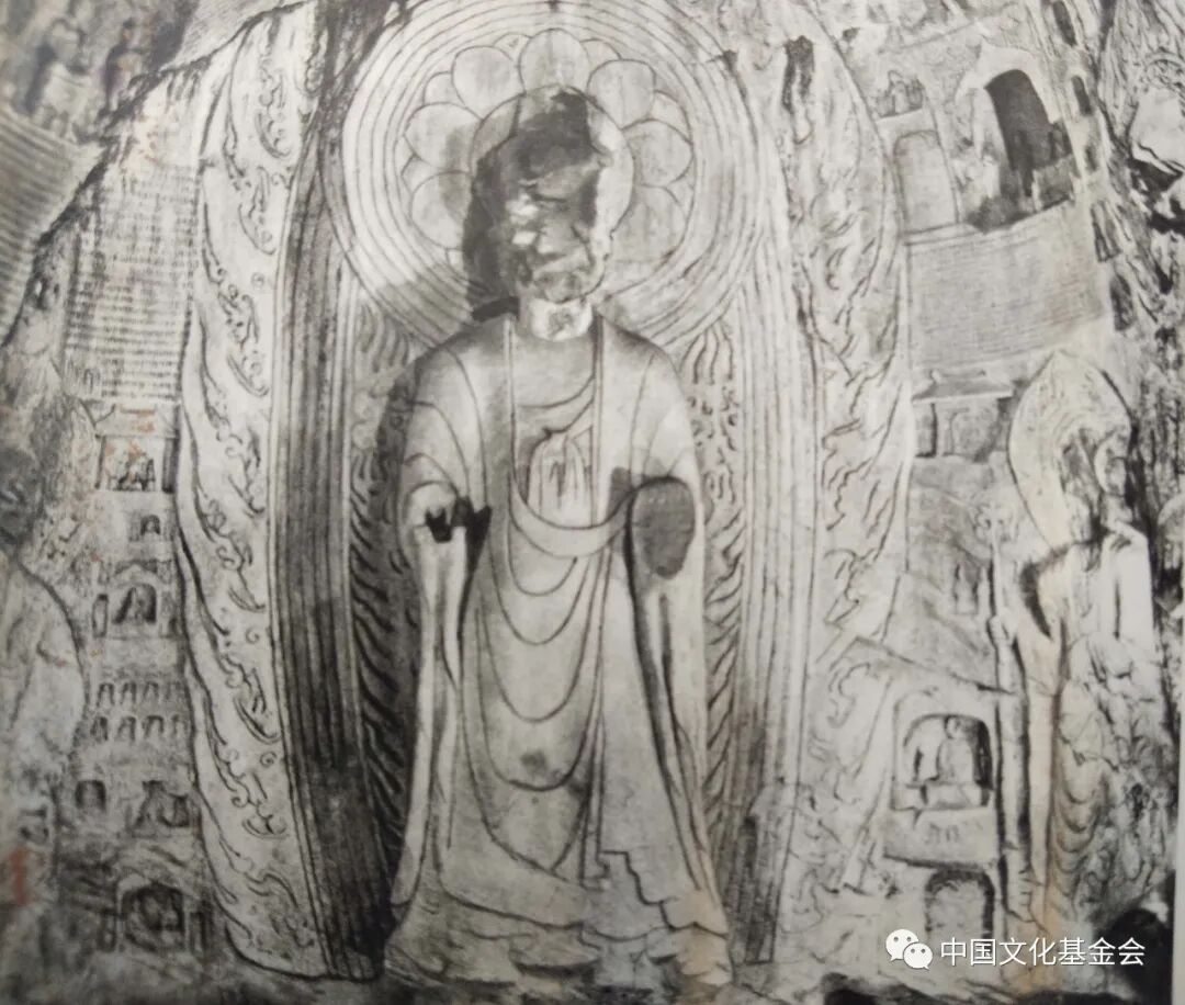 宾阳中洞是北魏迁都洛阳以后,景明元年(500年)开凿的,主尊是五尊像,一佛二弟子二菩萨,南北两壁皆为一佛二菩萨三尊像,皆面相清瘦,衣纹规整,悲悯下视,神秘微笑,沉静典雅,文质彬彬,更加注重精神刻划,完全是中国南方文人形象,已经中国化,文人化了。