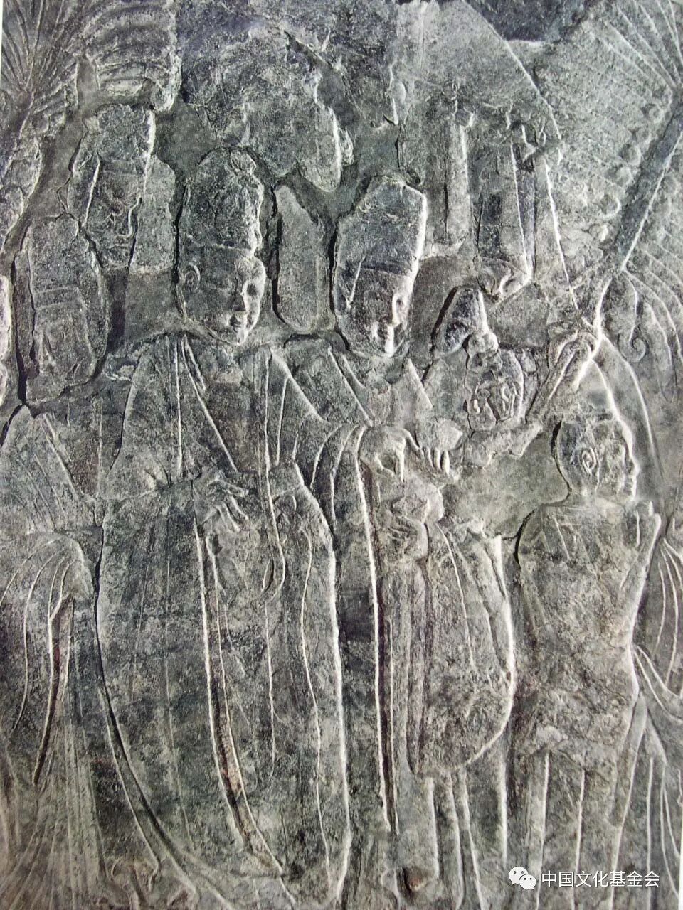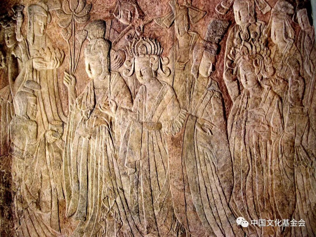 龙门浮雕艺术水平最高的是《帝后礼佛图》,即上述宾阳中洞的那两幅,现在美国,一在纽约大都会博物馆,一在堪萨斯纳尔逊博物馆,一是帝王行列,一是王后行列,互相对称,相向而行,礼佛队伍缓缓行进,褒衣博带,玉佩作响,汉官威仪,庄严肃穆,人物清瘦修长,文雅潇洒,衣纹平行规整,有韵律感和节奏感,装饰性很强,艺术水平很高。龙门北魏浮雕 《帝后礼佛图 》之皇后版,现藏于美国纳尔逊博物馆